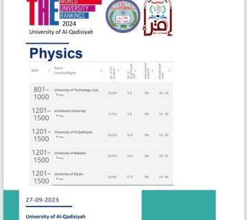 كلية التربية بجامعة القادسية تحصد المركز الثالث بين الجامعات العراقية في تصنيف التايمز البريطانيجامعة القادسية112/10/2023حازت كلية التربية بجامعة القادسية على المرتبة الثالثة على مستوى كليات وأقسام علوم الفيزياء في العراق في تصنيف التايمز البريطاني ... اقرأ أكثر