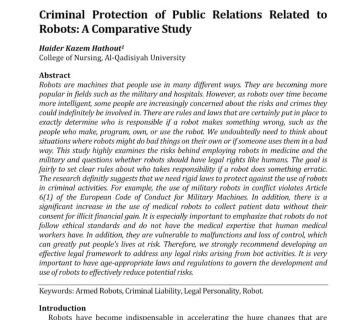تدريسي في كلية التمريض بجامعة القادسية ينشر بحثا علميا في مجلة عالميةجامعة القادسية124/09/2024نشر الاستاذ المساعد الدكتور حيدر كاظم حطحوط بحثا علميا بعنوان (الحماية الجنائية للعلاقات العامة المتعلقة بالروبوتات / دراسة مقارنة) في ... اقرأ أكثر