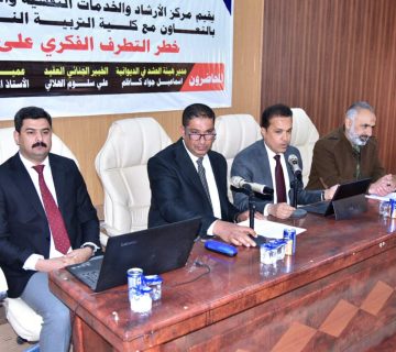 بحضور رئيس جامعة القادسية…مركز الارشاد والخدمات النفسية والاجتماعية بجامعة القادسية بالتعاون مع كلية التربية يقيم ندوة علمية حول التطرف الفكري.