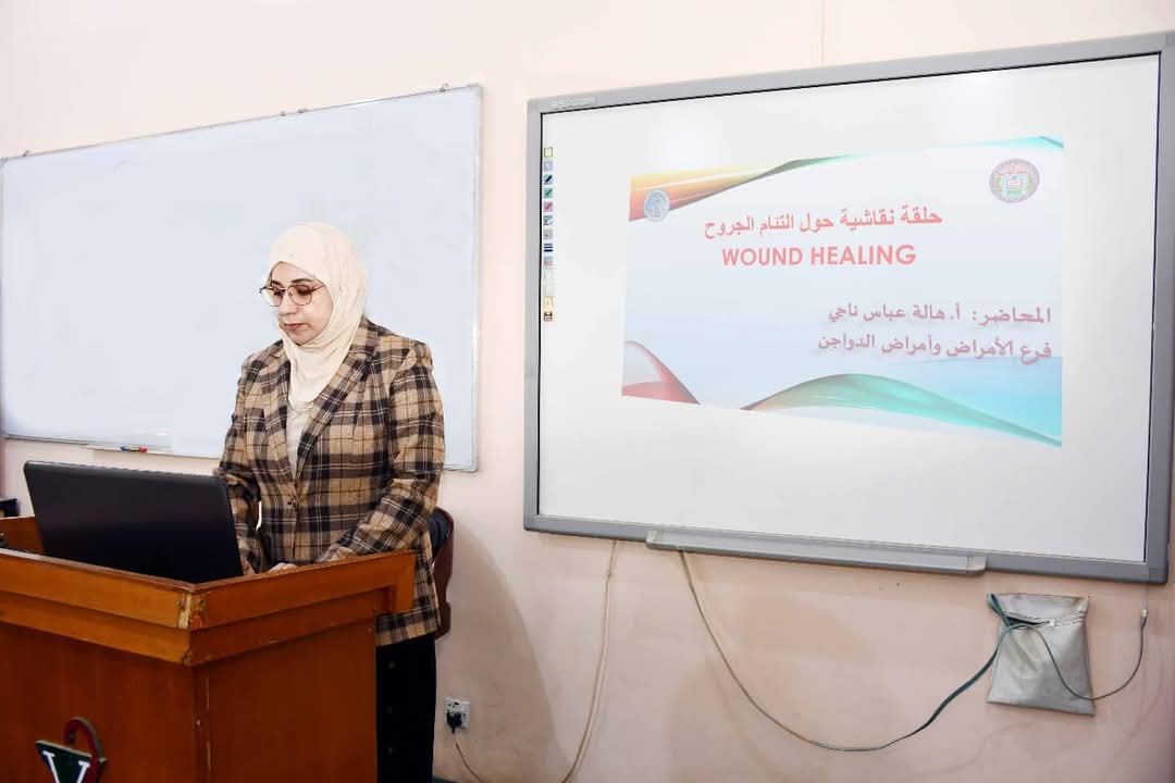 برعاية الاستاذ الدكتور كاظم جبر الجبوري رئيس جامعة القادسية وبإشراف الاستاذ الدكتور منير عبد الامير عبد الفتلاوي عميد كلية الطب البيطري أقام فرع الامراض وامراض الدواجن في الكلية حلقة نقاشية بعنوان (التئام الجروح wound healing) حاضر فيها أ. هالة عباس ناجي