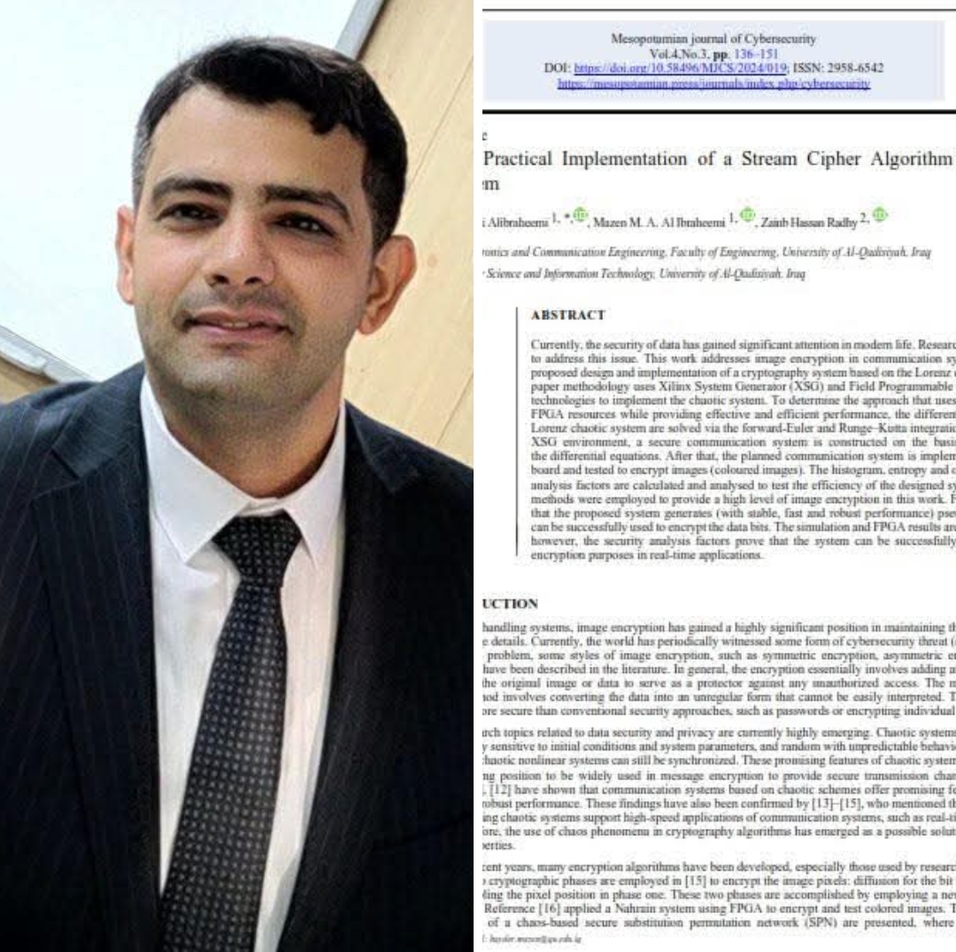 نشر التدريسي من قسم هندسة الالكترونيك والاتصالات بكلية الهندسة جامعة القادسية م.د. حيدر مازن مكي بحثا علميا والموسوم بـ(تصميم وتنفيذ عملي لخوارزمية التشفير الفيضي استنادًا إلى نظام لورينز) في مجلة بلاد ما بين النهرين للأمن السيبراني Mesopotamian journal of Cybersecurity العالمية الرصينة