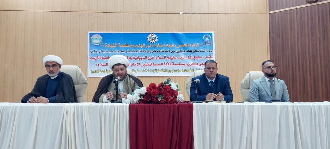برعاية رئيس جامعة القادسية الاستاذ الدكتور كاظم جبر الجبوري وبإشراف عميد كلية التربية الاستاذ الدكتور ستار حميد حمزة الجنابي أقامت كلية التربية وبالتعاون مع مجمع أهل البيت عليهم السلام ندوة فكرية بعنوان (الإمام الحسن عليه السلام نور الهدى وحكمة القيادة ) بمناسبة ولادة السبط المجتبى الإمام الحسن عليه السلام حاضر فيها السيد عماد الموسوي وم.د. أزهر حسن كريم وم.د. سلام باقر كاظم وم.م. تكليف خضير عباس
