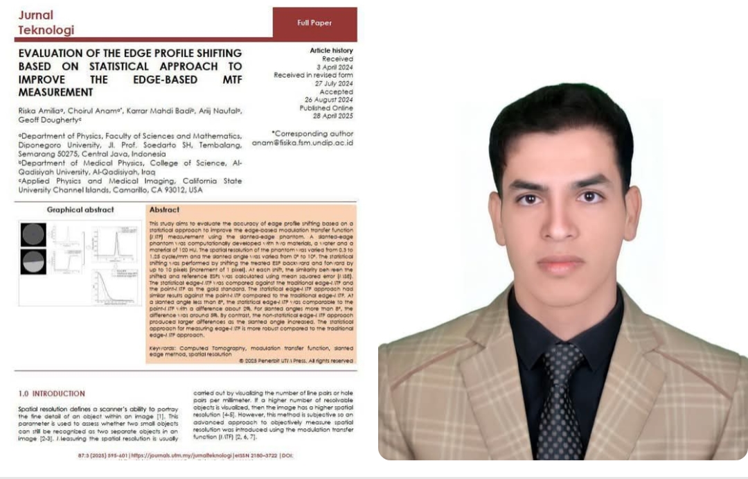 نشر التدريسي في قسم الفيزياء الطبية بكلية العلوم جامعة القادسية م.م. كرار مهدي بادي بحثاً علميا بالتعاون مع فريق بحثي مشترك من قسم الفيزياء التطبيقية والتصوير الطبي في جامعة كاليفورنيا، الولايات المتحدة الامريكية