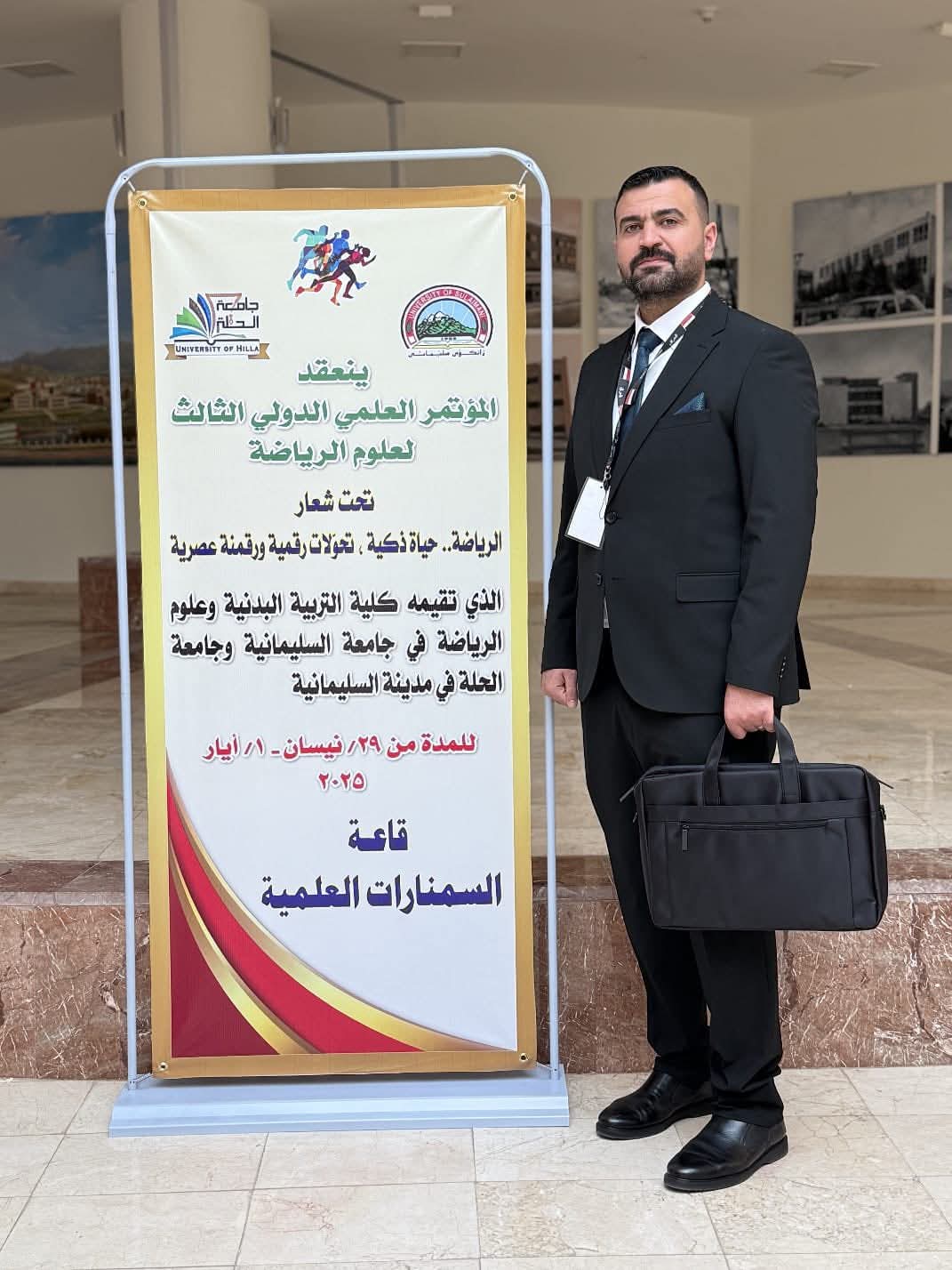 شارك الأستاذ المساعد الدكتور غيث عبدالله اللامي التدريسي في كلية الصيدلة جامعة القادسية في المؤتمر العلمي الدولي الثالث لعلوم الرياضة تحت شعار (الرياضة.. حياه ذكية ..تحولات رقمية ورقمنه عصرية) بصفته عضوا في لجنة علمية في لجان مناقشات المؤتمر الذي اقامته كلية التربية البدنية وعلوم الرياضة جامعة السليمانية وجامعة الحلة في مدينة السليمانية بمشاركة خبراء من مصر وليبيا والاردن وايران للفترة ٢٩/٤ إلى ١ /٥/ ٢٠٢٥