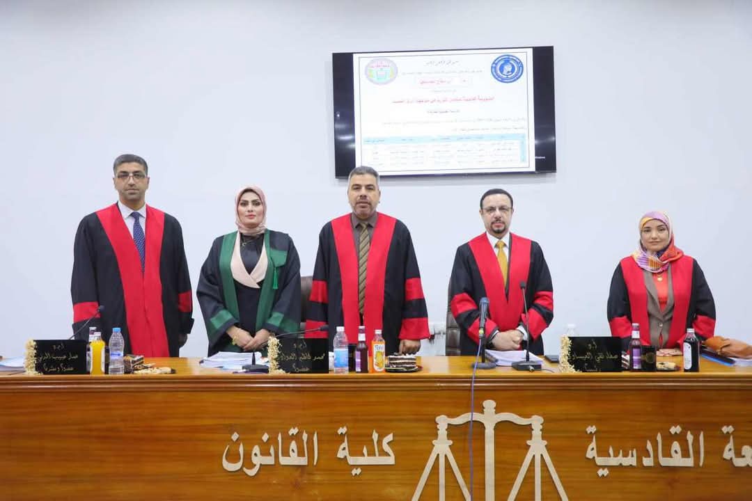 نوقشت رسالة الماجستير في كلية القانون بجامعة القادسية الموسومة بـ(المسؤولية القانونية لسلاسل التوريد في مواجهة الرقّ الحديث – دراسة تحليلية مقارنة) للباحثة مريم وناس سفاح وبإشراف أ.م.د. عمار حبيب المدني