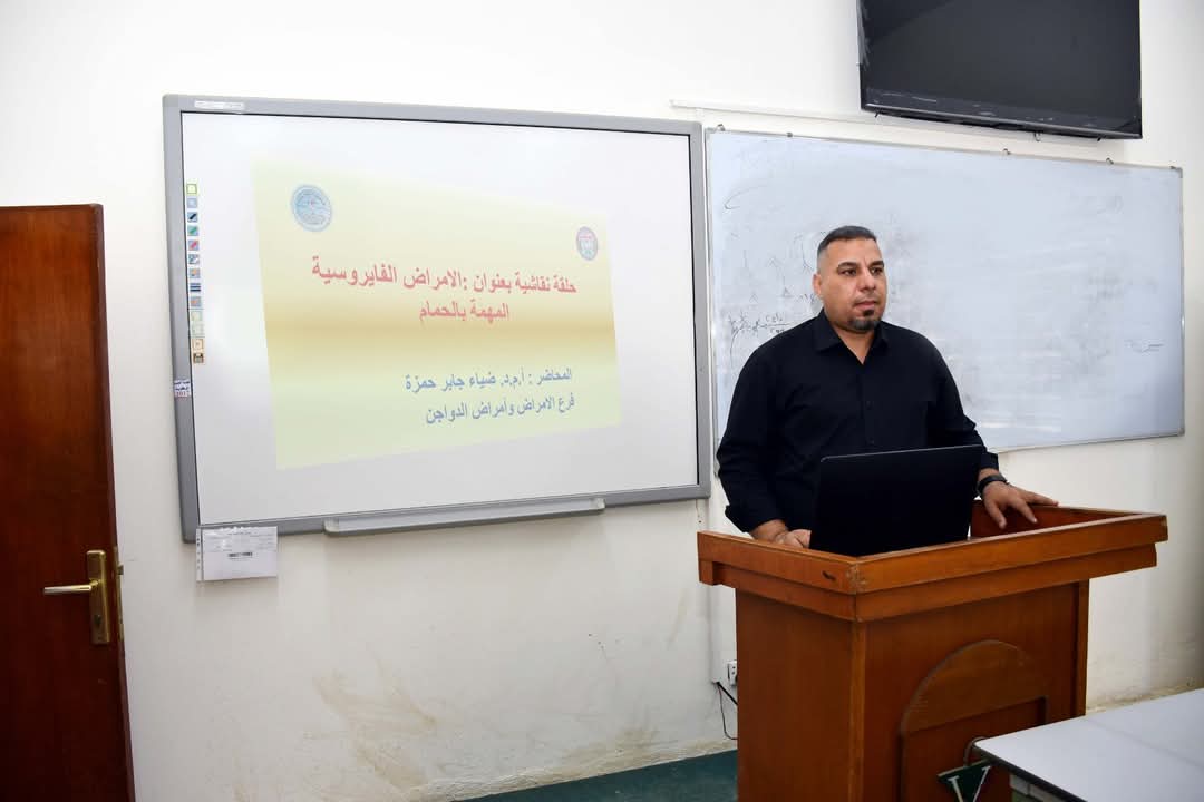برعاية الاستاذ الدكتور راهي كلف مهدي الياسري رئيس جامعة القادسية وبإشراف الاستاذ الدكتور منير عبد الامير عبد الفتلاوي عميد كلية الطب البيطري اقام فرع الامراض وامراض الدواجن في الكلية حلقة نقاشية حول الامراض الفايروسية المهمة بالحمام حاضر فيها أ.م.د. ضياء جابر حمزة