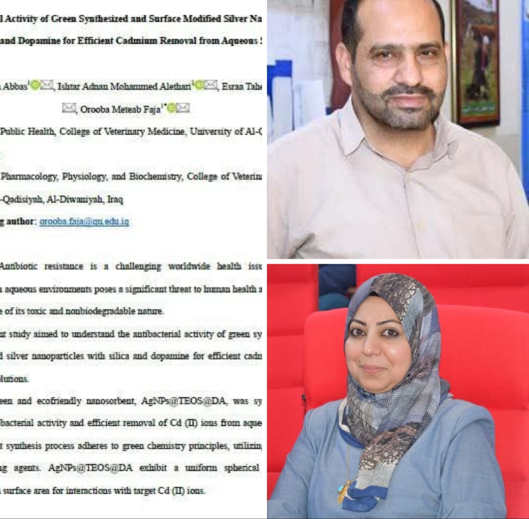 نشر أساتذة في كلية الطب البيطري بجامعة القادسية بحثًا علميًا في مجلة رصينة علمية رصينة ضمن الربع الثاني في مستوعبات سكوبس وكان البحث بعنوان (النشاط المضاد للبكتيريا للجسيمات النانوية الفضية الخضراء والمعدلة سطحيًا بالسيليكا والدوبامين من أجل الإزالة الفعالة للكادميوم من المحاليل المائية) وهم كل من ا.م كاظم حسن عباس و ا.م.د عشتار عدنان محمد و ا.م اسراء طاهر مسلم وتم النشر في مجلة open veterinary journal وهي مجلة علمية مصنفة ضمن مستوعبات سكوباس ضمن الربع الثاني والتي لها CiteScore مقداره 1.2