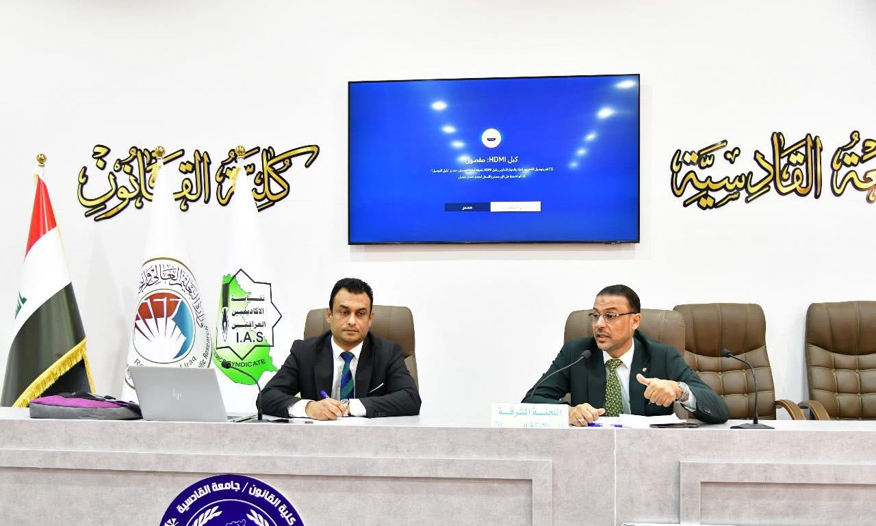في إطار برنامج تطوير مهارات طلبة الدراسات العليا في مرحلة البحث نظمت كلية القانون بجامعة القادسية ورشة علمية متخصصة بعنوان (تحليل النصوص القانونية) حاضر فيها الاستاذ الدكتور عدنان عاجل عبيد وأدارها المدرس الدكتور علي حمزة جبر