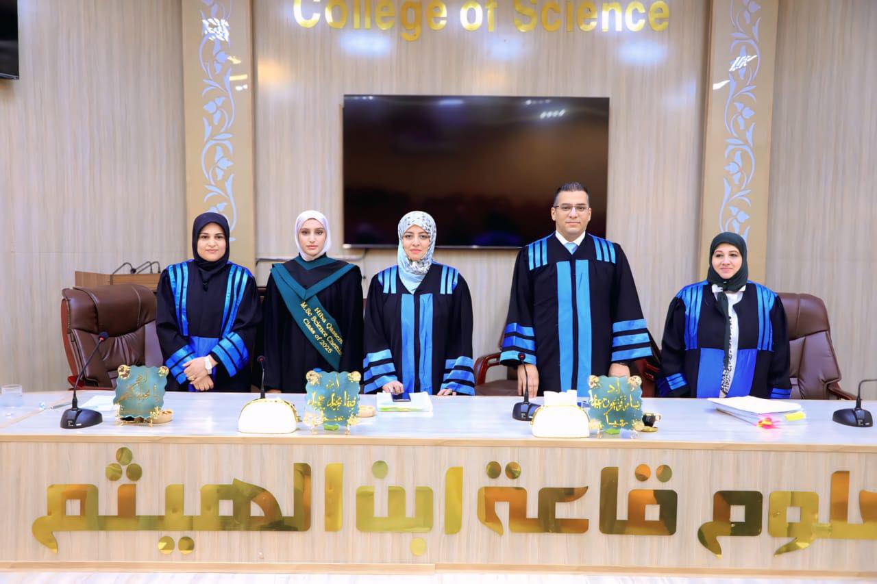 نوقشت في قسم الكيمياء بكلية العلوم جامعة القادسية رسالة الماجستير الموسومة بـ (الاستخلاص السائل بالمذيب القابل للتحويل مع الاستخلاص الصلب المغناطيسي لتقدير بعض الأدوية) للباحثة هبة قاسم كاظم وبإشراف الأستاذ الدكتورة زينا محمد كاظم
