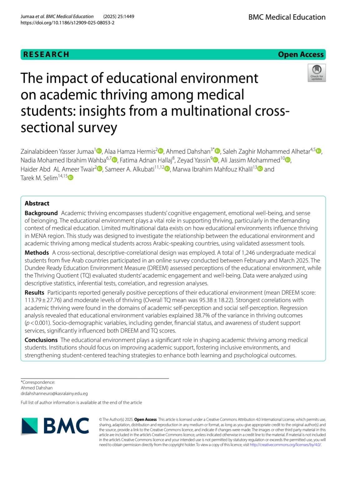 نشر م.د. حيدر عبد الأمير طوير وم.د. علاء حمزة حرمس وم.م. زين العابدين ياسر جمعة من كلية التمريض بجامعة القادسية بحثًا علميًا في مجلة BMC Medical Education الصادرة عن دار النشر العالمية Springer Nature والمفهرسة ضمن قواعد بيانات Scopus Q1 بعنوان (تأثير البيئة التعليمية على الازدهار الأكاديمي بين طلبة المجموعة الطبية : رؤى من دراسة مقطعية متعددة الجنسيات)