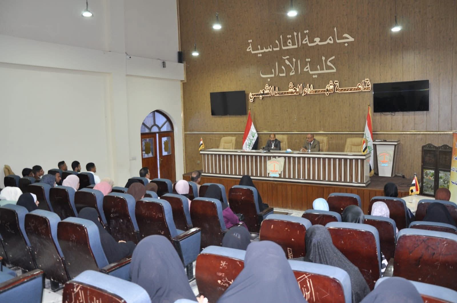برعاية السيد رئيس جامعة القادسية الاستاذ الدكتور راهي كلف مهدي الياسري وبإشراف السيد عميد كلية الآداب الأستاذ الدكتور نبيل عمران الخالدي أقام قسم اللغة العربية في كلية الآداب بجامعة القادسية ندوة علمية بعنوان (الخمر والإدمان في التراث اللغوي العربي) حاضر فيها أ.م.د. حسام عدنان الياسري وأدار الندوة الأستاذ الدكتور حيدر حبيب حمزة