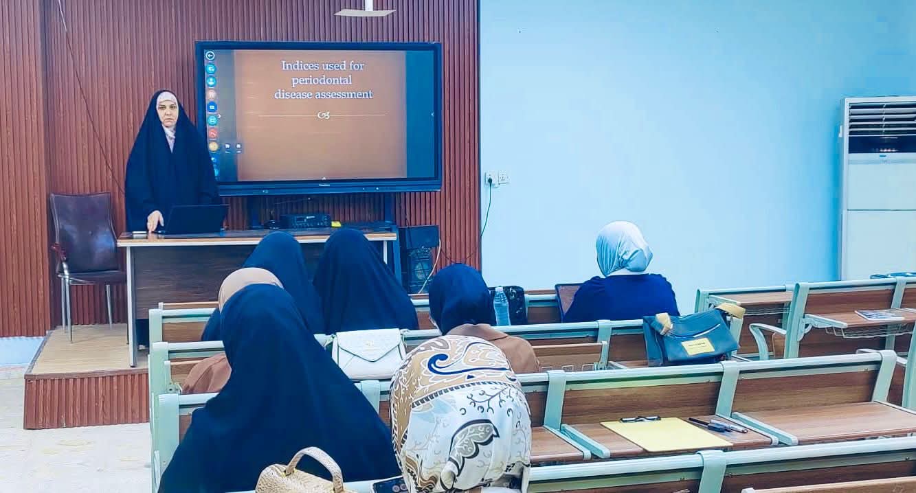 برعاية السيد رئيس جامعة القادسية الأستاذ الدكتور راهي كلف مهدي الياسري وبإشراف عميد كلية طب الأسنان الأستاذ الدكتور علي حسن علي مراد أقامت وحدة التعليم المستمر بكلية طب الأسنان دورة تدريبية بعنوان (المؤشرات التشخيصية لأمراض اللثة) حاضر فيها م.م. زهراء جواد حميدي وم.م. فاتن عبد الستار