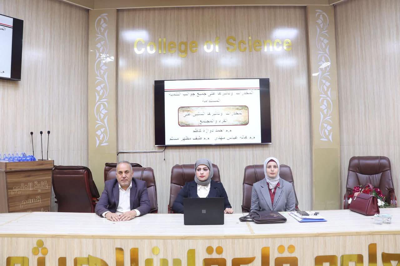 برعاية السيد رئيس جامعة القادسية الاستاذ الدكتور راهي كلف مهدي الياسري وبإشراف السيد عميد كلية العلوم الاستاذ الدكتور سلوان علي عبيد وبمناسبة الاسبوع العراقي لمكافحه المـ.خدرات اقامت وحدة الإرشاد النفسي والتوجيه الاجتماعي في كلية العلوم ورشة بعنوان (المـ.خدرات وتأثيرها السلبي على الفرد والمجتمع) حاضر فيها م.م هاله عباس مهدي وم.م احمد دوازه كاظم وم.م طيف مظهر مسلم