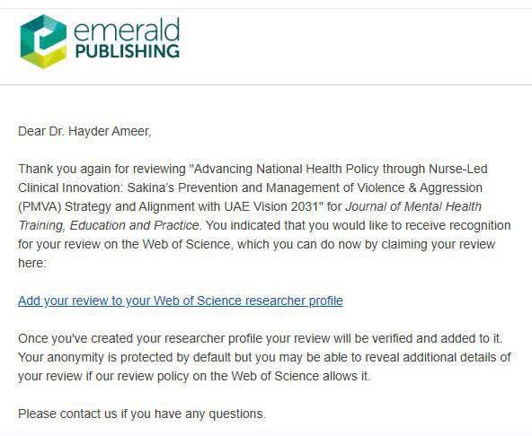 وقد تلقّى الدكتور حيدر إشعارًا رسميًا من المجلة يُثني على جهوده العلمية ودقّة مراجعته، مع منحه فرصة إضافة نشاطه التحكيمي إلى ملفه البحثي ضمن منصة Web of Science تقديرًا لمساهماته في تعزيز جودة البحث العلمي