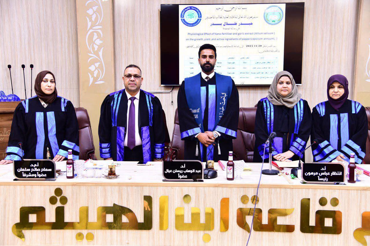 نوقشت في كلية العلوم بجامعة القادسية رسالة الماجستير الموسومة بـ (تأثير سماد الفسفور النانوي والمستخلص الاثيلي لنبات الثوم Allium Sativum في النمو الخضري والفسلجي والحاصل والمواد الفعالة لنبات الفلفل الحار Capsicum annuum L) الباحث حيدر طلال بدر الساعدي وبإشراف أ.م.د سماح صالح سلمان