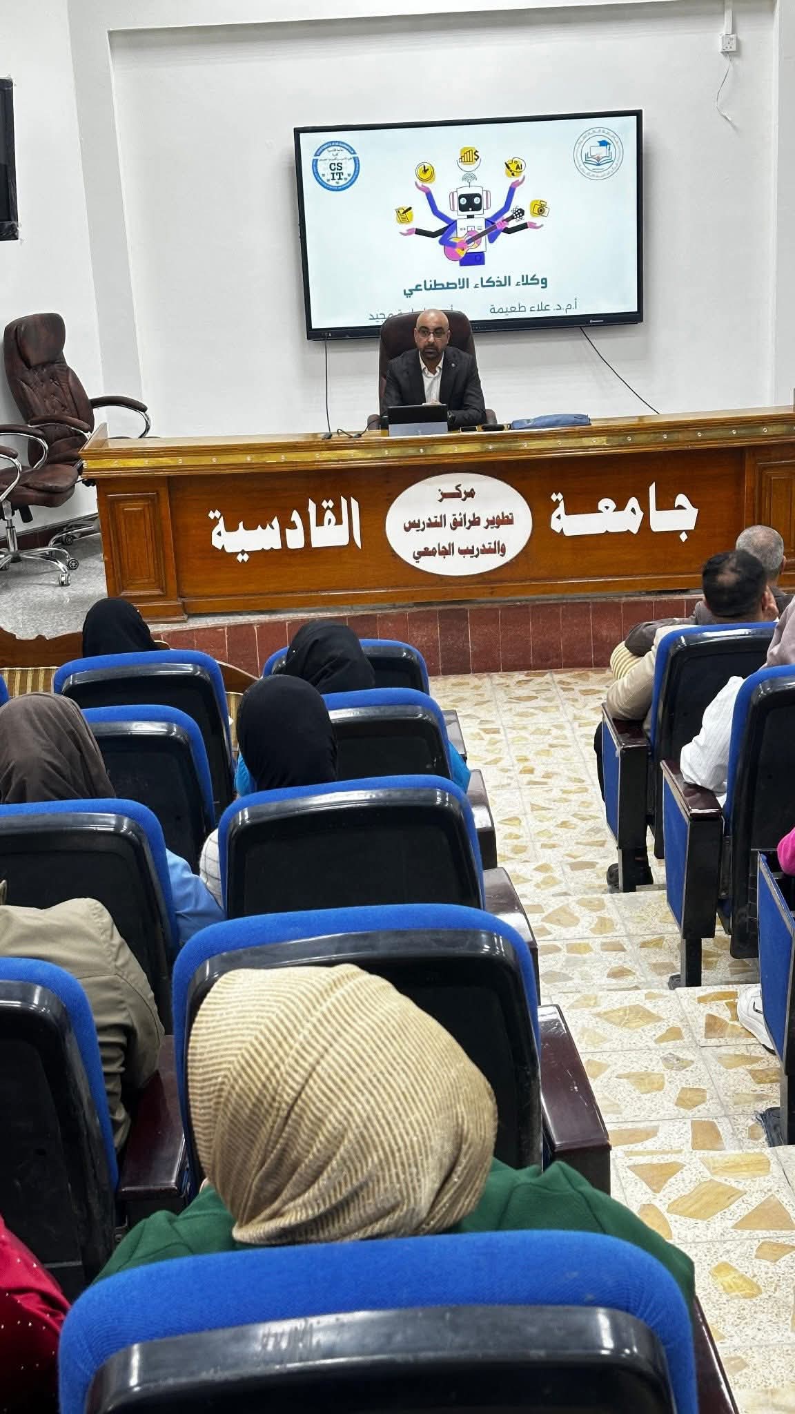 برعاية السيد رئيس جامعة القادسية الاستاذ الدكتور راهي كلف مهدي الياسري وبإشراف السيد مدير مركز الحاسبة الالكترونية الاستاذ المساعد الدكتور أسامة مجيد هلال اقام مركز الحاسبة الالكترونية في جامعة القادسية وبالتعاون مع كلية علوم الحاسوب وتكنولوجيا المعلومات ورشة علمية تثقيفية بعنوان (وكلاء الذكاء الاصطناعي AI Agents) حاضر فيها الأستاذ المساعد الدكتور علاء طعيمة والاستاذ المساعد الدكتور أسامة مجيد هلال
