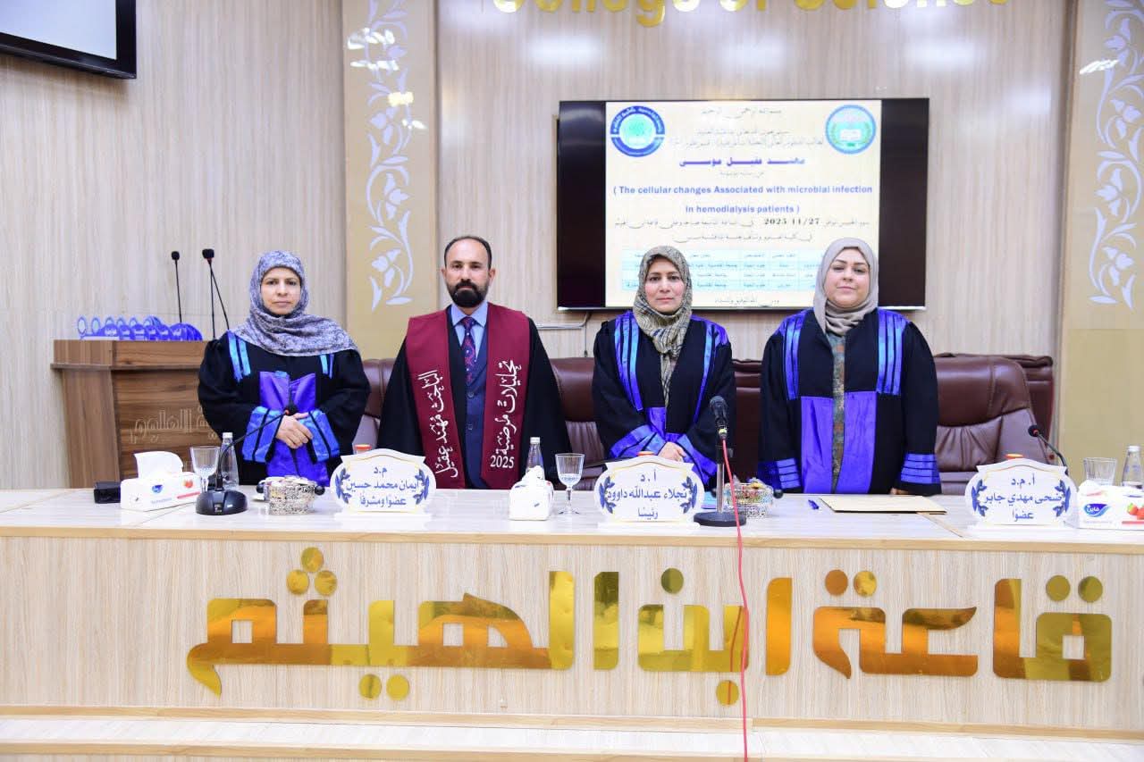 نوقشت في كلية العلوم بجامعة القادسية رسالة دبلوم عالي الموسومة بـ (التغيرات الخلوية المصاحبة للعدوى الميكروبية لدى مرضى غسيل الكلى) للباحث مهند عقيل موسى وبإشراف م.د ايمان محمد حسين