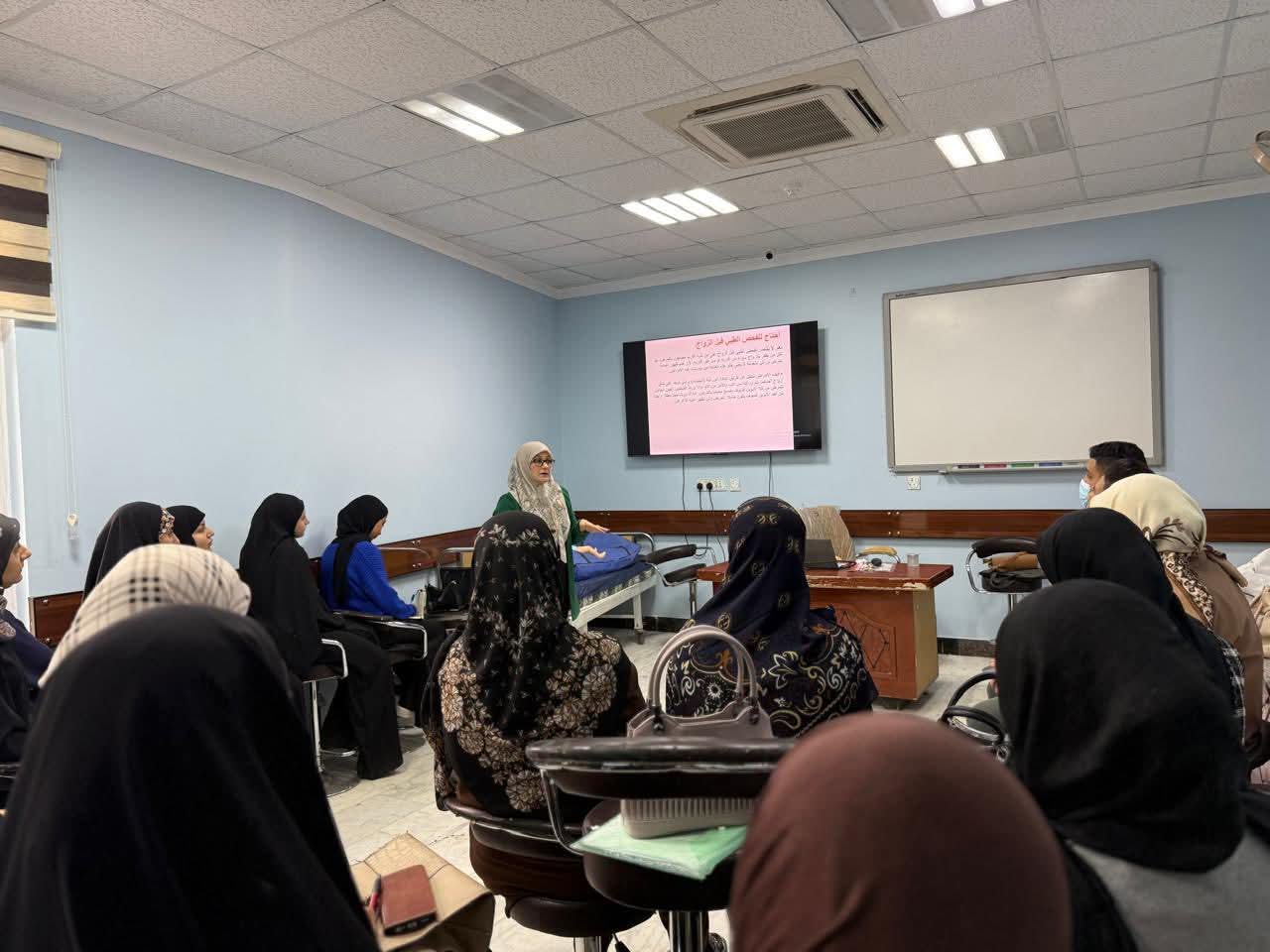 برعاية السيد رئيس جامعة القادسية الاستاذ الدكتور راهي كلف مهدي الياسري وبإشراف السيد عميد كلية التمريض الاستاذ الدكتور ضرغام مجيد الفتلاوي أقامت كلية التمريض دورة علمية بعنوان (فحوصات ما قبل الزواج وأهميتها) حاضر فيها ا.م.د. فادية حسين علي وم.م. هبة جاسم