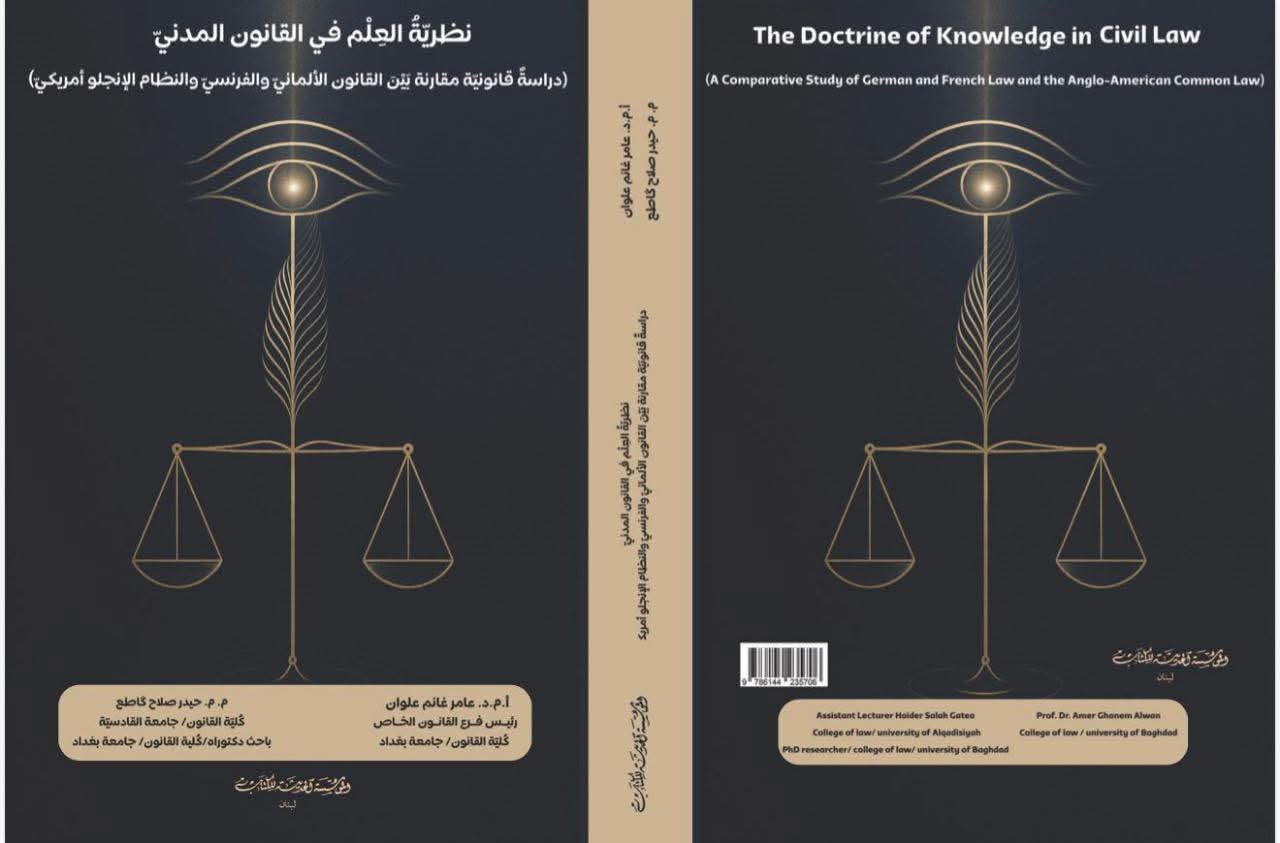 صدر عن المؤسسة الحديثة للكتاب في بيروت كتابا بعنوان (نظرية العلم في القانون المدني – دراسة قانونية مقارنة بين القانون الالماني والفرنسي والنظام الانجلو أمريكي) من تأليف التدريسي في كلية القانون بجامعة القادسية م.م. حيدر صلاح كاطع وبالاشتراك مع أ.م.د. عامر غانم علوان التدريسي في كلية القانون بجامعة بغداد