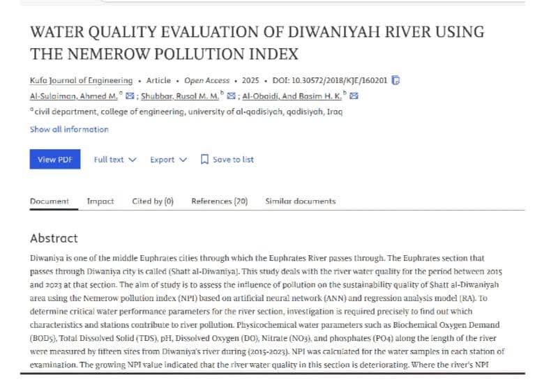 نشر التدريسي في كلية الهندسة بجامعة القادسية أ.م.د. احمد مكي جبار البحث الموسوم (تقييم جودة مياه نهر الديوانيه باستخدام مؤشر التلوث (NPI)) في مجلة Kufa Journal of Engineering مجلة الكوفة الهندسية العالمية الرصينة