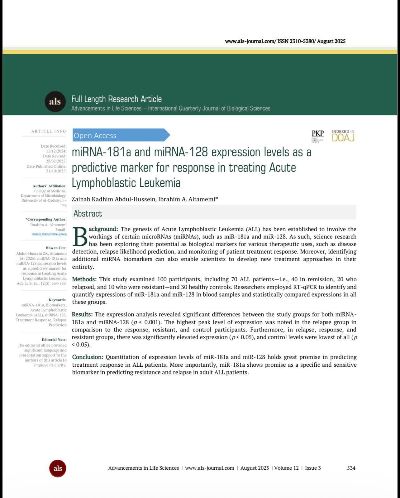 نشر التدريسي في فرع الاحياء المجهرية بكلية الطب جامعة القادسية الاستاذ الدكتور ابراهيم عبد المجيد مصطفى بالاشتراك مع طالبة الدكتوراه زينب كاظم عبدالحسين بحثا في مجلة عالمية ضمن تصنيف سكوبس Advancement in life sciences بعنوان (مستويات التعبير الجيني لكل من miRNA-181a وmiRNA-128 كعلامة تنبؤية للاستجابة العلاجية لمرضى سرطان الدم الليمفاوي الحاد)