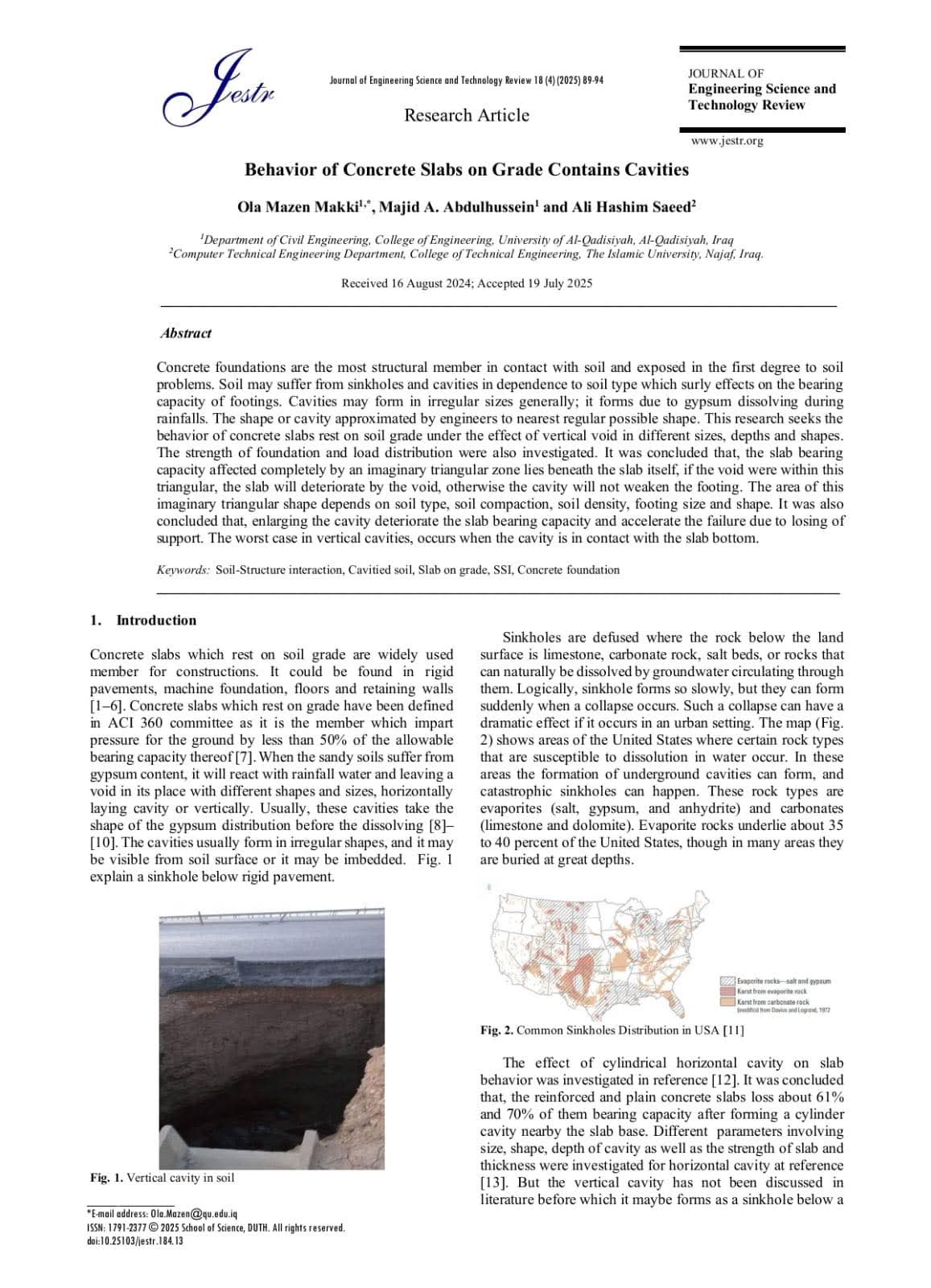 نشرت التدريسية في كلية الهندسة بجامعة القادسية م.د. علا مازن مكي والتدريسي م.م. ماجد عبد المحمد بحثا علميا مشتركا والموسوم بـ (تأثير التربة الحاوية على فراغات على مقاومة البلاطات الخرسانية) في مجلة مراجعة علوم الهندسة والتكنولوجيا العالمية الرصينة