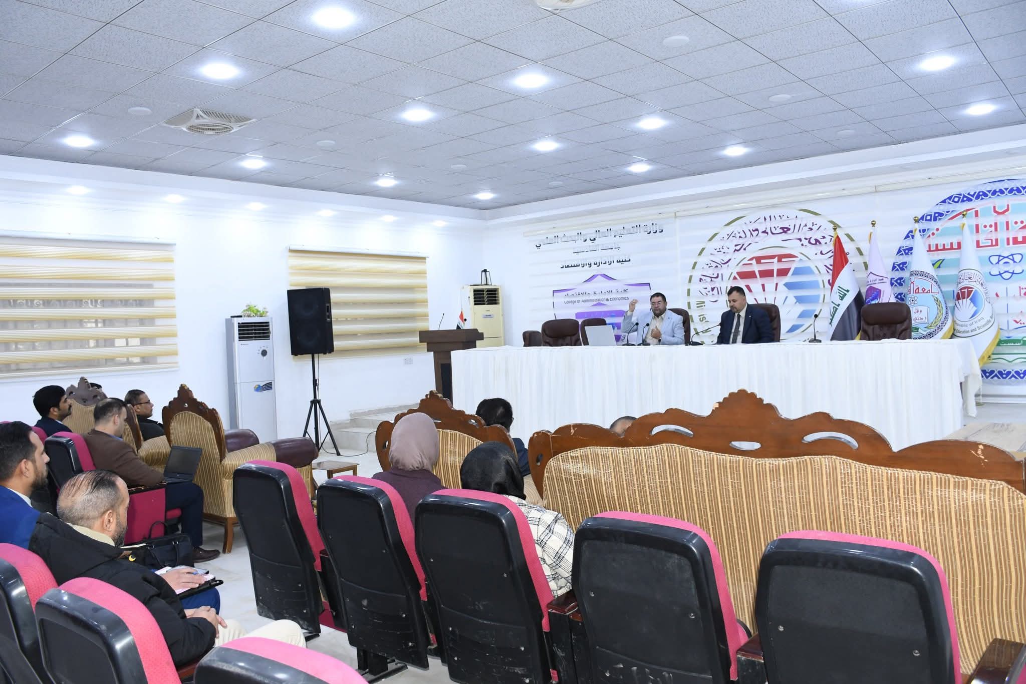 حاضر بالورشة المنعقدة في قاعة المقريزي في كلية الادارة والاقتصاد ا.م.د قصي عكار رئيس قسم الرياضيات في كلية العلوم وادارها الاستاذ الدكتور مهند السعدون.