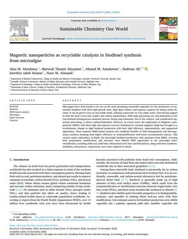 ساهم المدرس المساعد رضوان علي كاطع التدريسي في كلية طب الأسنان بجامعة القادسية بنشر بحث علمي مشترك في مجلة Sustainable Chemistry One World التابعة لدار النشر Elsevier المصنفة ضمن مستوعبات سكوباس بعنوان (الجسيمات النانوية المغناطيسية كمحفزات قابلة لإعادة التدوير في تصنيع وقود الديزل الحيوي من الطحالب الدقيقة)
