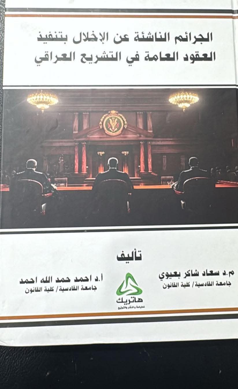 صدر عن دار هاتريك للطباعة والنشر والتوزيع كتابٌ بعنوان (الجرائم الناشئة عن الإخلال بتنفيذ العقود العامة في التشريع العراقي) من تأليف التدريسيين في كلية القانون بجامعة القادسية الاستاذ الدكتور احمد حمد الله احمد والمدرس الدكتورة سعاد شاكر بعيوي