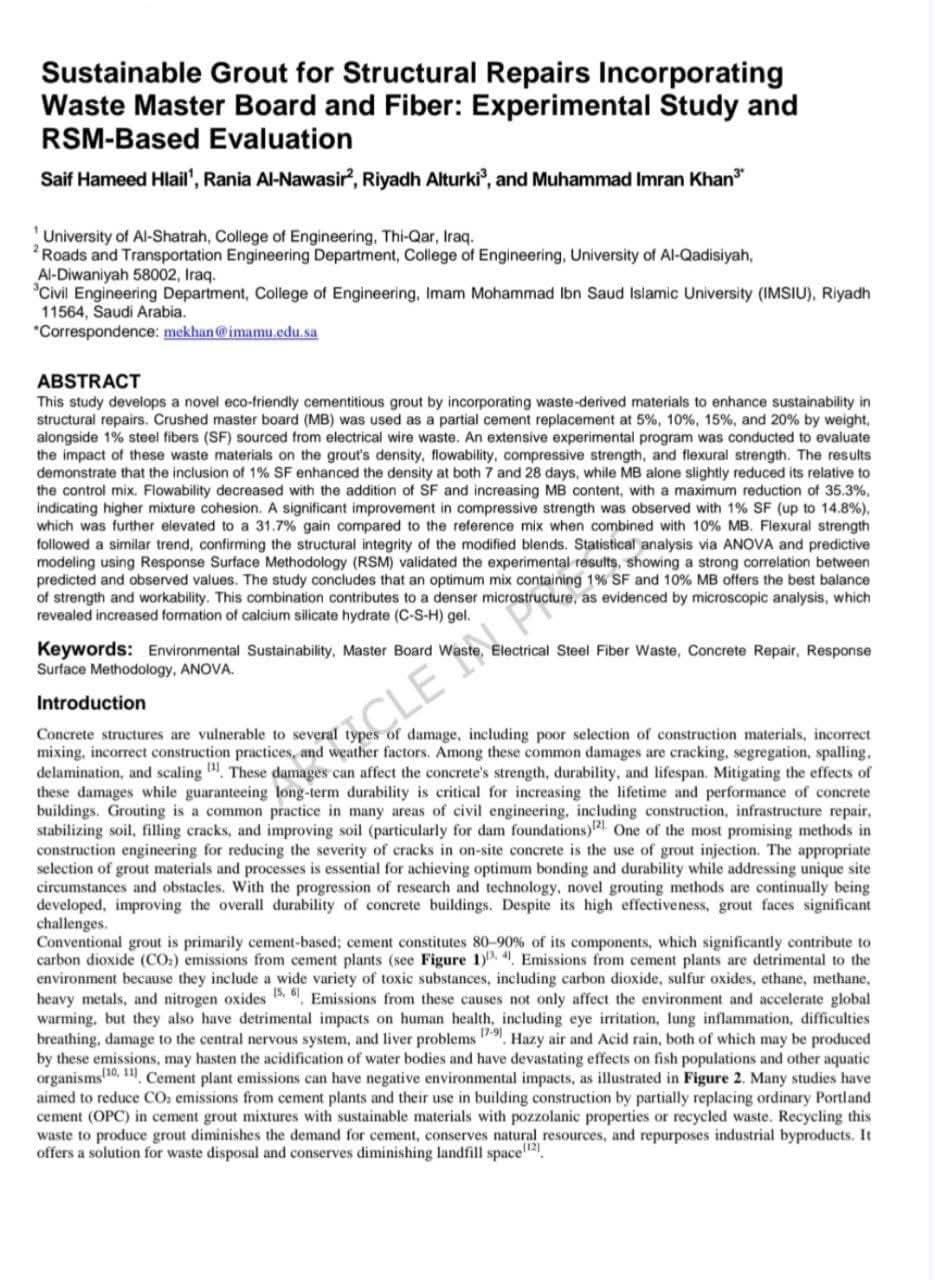 ويتناول البحث تطوير ملاط إسمنتي صديق للبيئة باستخدام مواد ناتجة عن النفايات، حيث استُخدم لوح الماستر المطحون بنسبة تصل إلى 20% مع 1% من الألياف الفولاذية المستخلصة من مخلفات الأسلاك الكهربائية. وأظهرت النتائج تحسناً ملحوظاً في مقاومتي الانضغاط والانحناء، ولا سيما عند الخلطة المثلى (1% ألياف فولاذية + 10% ماستر بورد)، مع تحقيق توازن مناسب بين المتانة وقابلية التشغيل، بما يسهم في تعزيز الاستدامة في أعمال ترميم الخرسانة الموقعية
