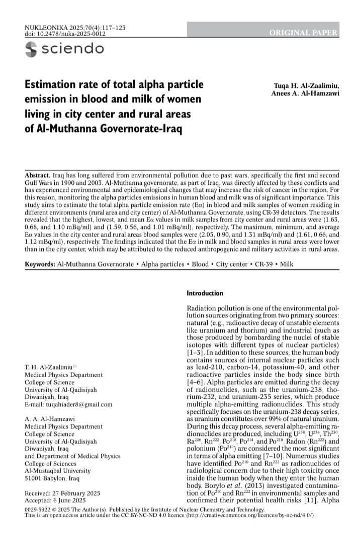 نشر الأستاذ الدكتور أنيس علي حسن الحمزاوي والمدرس المساعد تقى حيدر الظالمي، التدريسيان في قسم الفيزياء الطبية بكلية العلوم بجامعة القادسية، بحثاً علمياً في مجلة Nukleonika العالمية المصنفة ضمن مستوعبات Scopus.