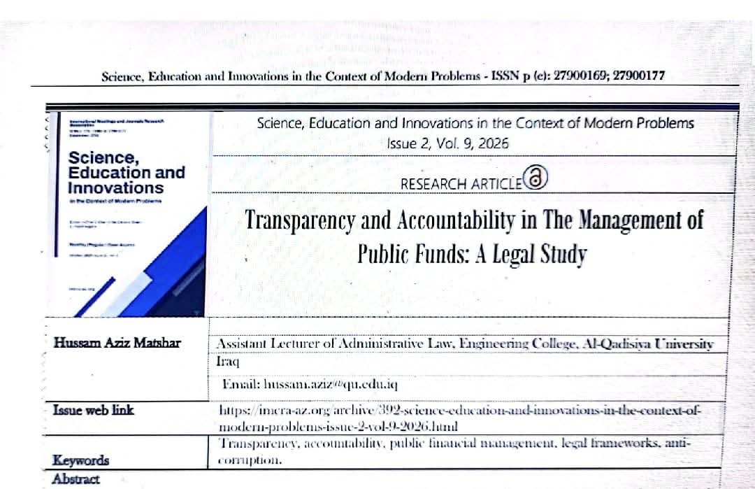 نشر التدريسي في كلية الهندسة بجامعة القادسية م.م حسام عزيز مطشر البحث الموسوم (الشفافية والمساءلة في إدارة الأموال العامة دراسة قانونية) في مجلة