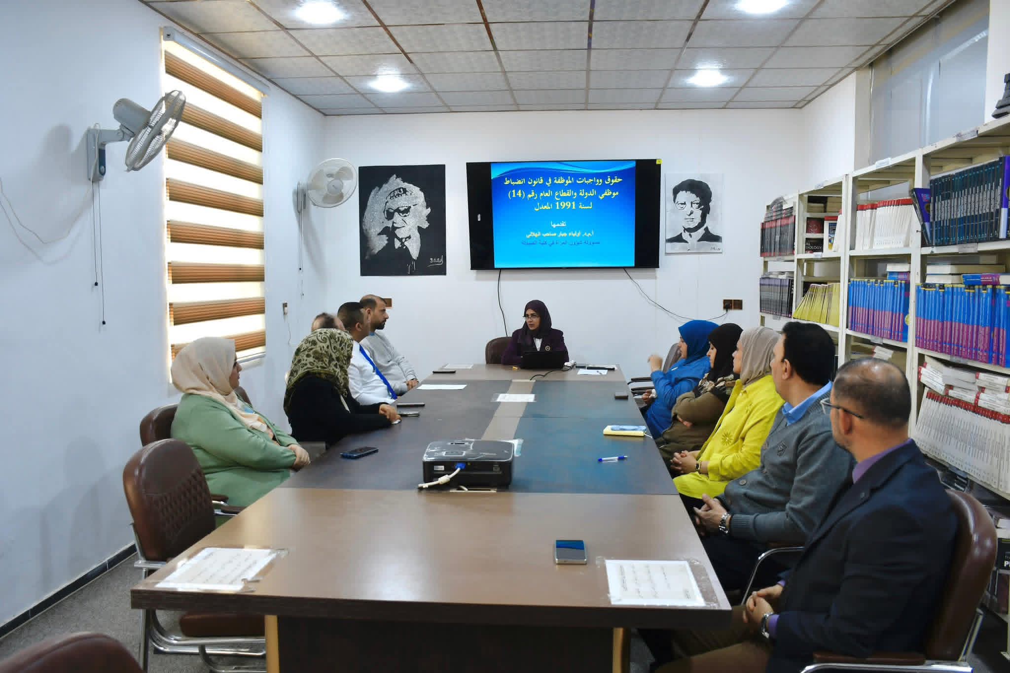 برعاية السيد رئيس جامعة القادسية الأستاذ الدكتور راهي كلف مهدي الياسري وبإشراف السيد عميد كلية الصيدلة الأستاذ المساعد الدكتور أسعد حسن الزيدي اقامت وحدة شؤون المرأة في كلية الصيدلة بجامعة القادسية دورة علمية بعنوان (حقوق وواجبات الموظف في قانون انضباط موظفي الدولة والقطاع العام رقم ١٤ لسنة ١٩٩١ المعدل) حاضر فيها أ.م.د اولياء جبار الهلالي وإدارة الدورة م.د نور عبد الخضر صلال