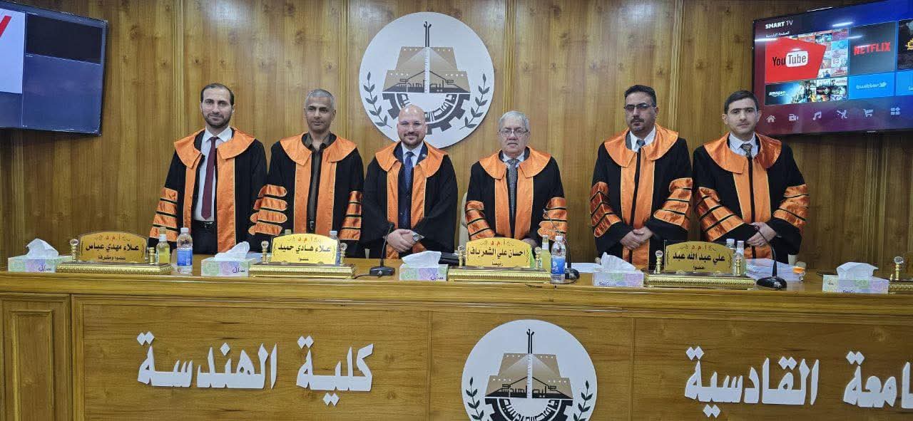 ناقش قسم الهندسة المدنية في كلية الهندسة بجامعة القادسية رسالة الماجستير الموسومة بـ (الآلية المقترحة لتعزيز القدرة الانشائية لأساس قائم) على قاعة مناقشات الدراسات العليا للباحث مصطفى حيد عاجل وبإشراف أ.م.د. علاء مهدي عباس وأ.م.د. سيف عماد عكوبي