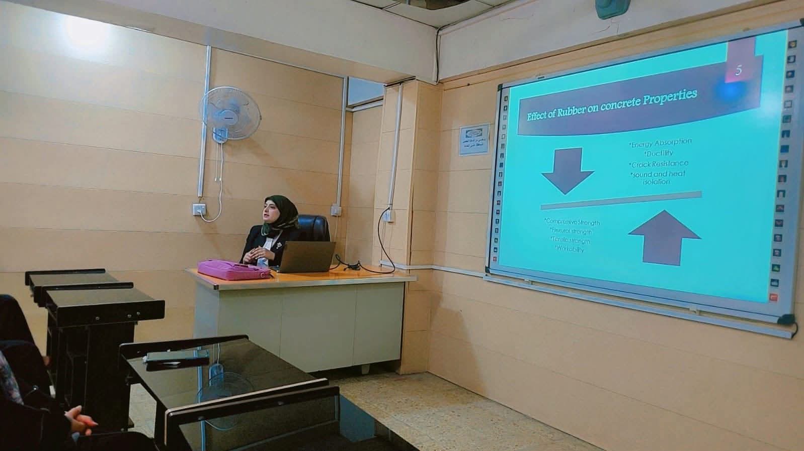 نظم قسم الهندسة المدنية في كلية الهندسة بجامعة القادسية دورة تدريبية بعنوان (الخلطات الخرسانية المطاطية) على قاعة التعليم المستمر حاضر فيها م.د. علا مازن مكي وم.م.فاتن فاهم عزيز