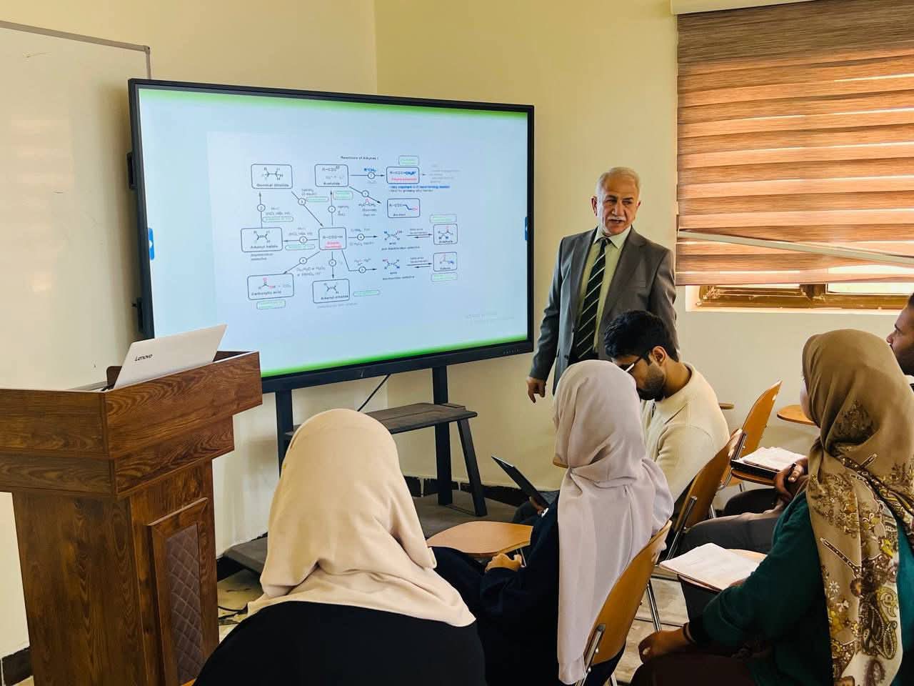 برعاية السيد رئيس جامعة القادسية الاستاذ الدكتور راهي كلف مهدي الياسري وبإشراف السيد عميد كلية العلوم الاستاذ الدكتور سلوان علي عبيد أقيمت في قسم الكيمياء بكلية العلوم ندوة علمية بعنوان (التخليق العضوي ودوره في صناعة وتطوير الأدوية) حاضر فيها أ.د. نبيل عبد عبد الرضا وأ.م.د طيبه ابراهيم محمد