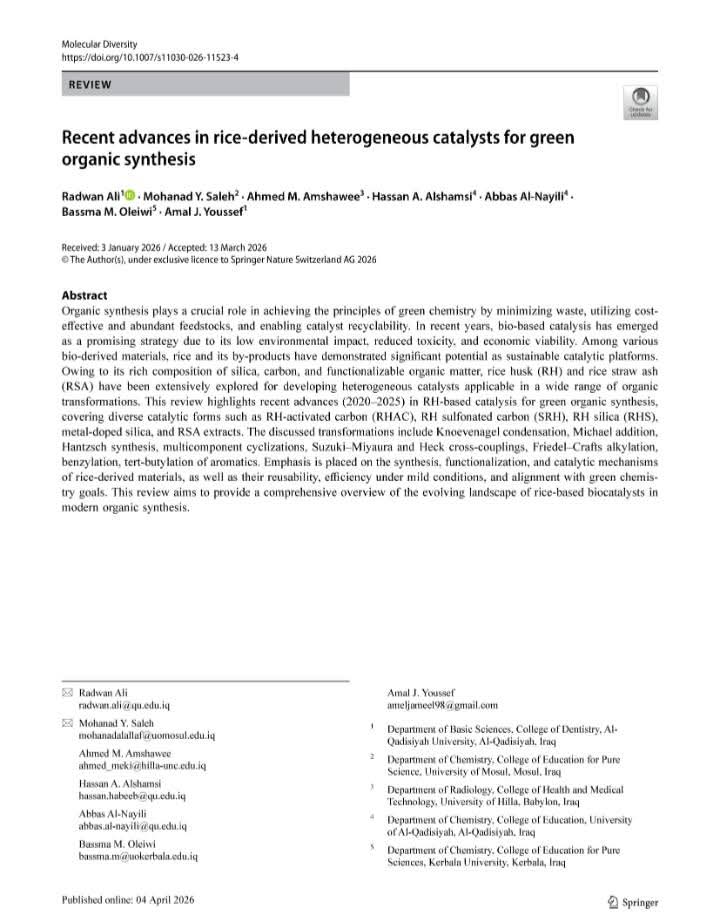نشر المدرس المساعد رضوان علي كاطع التدريسي في كلية طب الأسنان بجامعة القادسية بحثًا علميًا بالاشتراك مع تدريسيين من جامعة الموصل وجامعة الحلة إضافة إلى تدريسيين من جامعة القادسية وهم الأستاذ الدكتور عباس النايلي والأستاذ الدكتور حسن الشمسي في كلية التربية وجاء البحث بعنوان (في المحفزات غير المتجانسة المشتقة من الأرز للتخليق العضوي الأخضر)