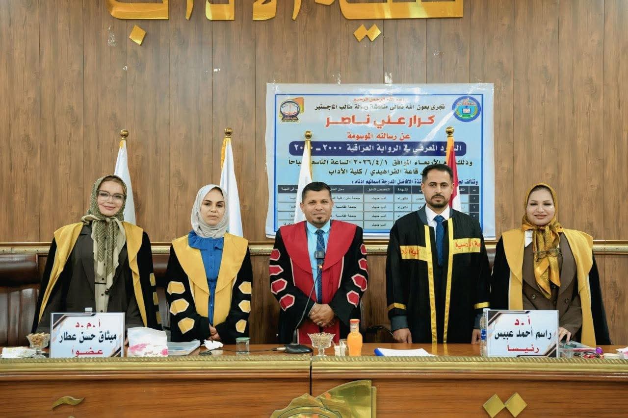 بحثت في كلية الآداب بجامعة القادسية رسالة الماجستير الموسومة بـ (السرد المعرفي في الرواية العراقية من 2000 – 2020) للباحث كرار علي ناصر وبإشراف أ.م.د. رنا فرمان محمد