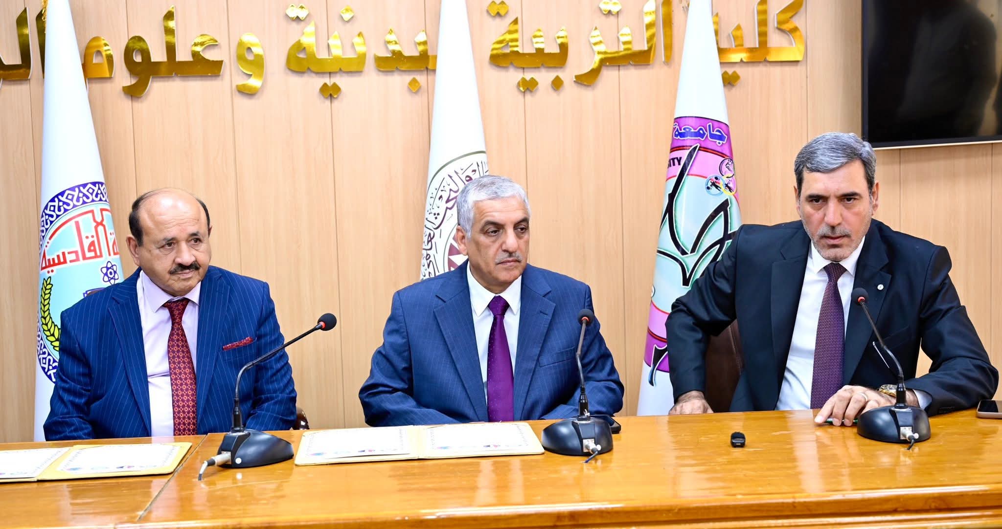 أبرمت كلية التربية البدنية وعلوم الرياضة بجامعة القادسية ممثلةً بالسيد العميد الأستاذ الدكتور بشير شاكر العوادي وثيقة تعاون علمي أولي مشترك مع كلية التربية البدنية وعلوم الرياضة بجامعة المصطفى الأهلية ممثلةً بالسيد عميد الكلية الأستاذ الدكتور محجوب ابراهيم ياسين المشهداني بحضور مساعد رئيس الجامعة للشؤون الأدارية الأستاذ الدكتور محمد حمزة الهاشمي وأعضاء مجلس الكلية ونخبة من أساتذتها.