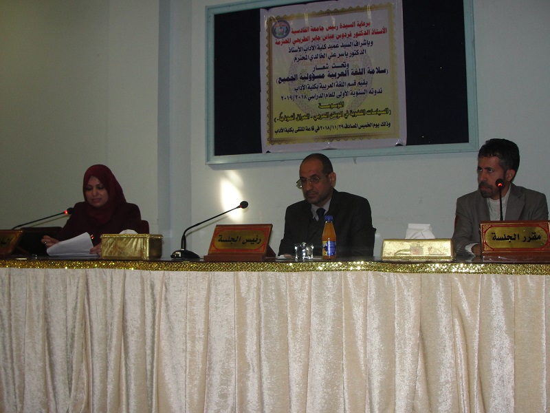 برعاية الاستاذ الدكتور فردوس عباس الطريحي رئيس جامعة القادسية, وبإشراف الاستاذ الدكتور ياسر علي عبد الخالدي عميد كلية الآداب وتحت شعار سلامة اللغة العربية مسؤولية الجميع , نظم قسم اللغة العربية في كلية الآداب في جامعة القادسية ندوته الموسومة بـ (السياسات اللغوية في الوطن العربي بين الواقع والطموح – العراق انموذجاً) .