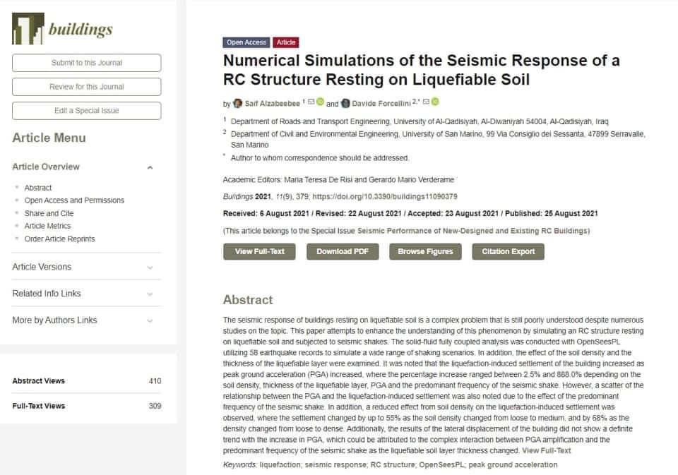 نشر التدريسي في قسم هندسة الطرق النقل بكلية الهندسة في جامعة القادسية الدكتور سيف عماد عكوبي وبالتعاون مع باحث من جامعة سان مارينو بحثه الموسوم : التمثيل العددي للتصرف الزلزالي لهيكل كونكريتي مسلح مشيد على تربة قابلة للتسييل