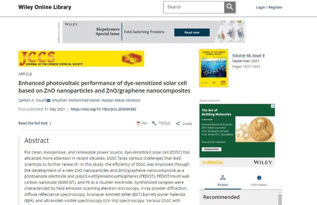 نشر التدريسي في قسم الكيمياء بكلية التربية في جامعة القادسية ألاستاذ الدكتور قحطان عدنان يوسف بحثا علميا مشتركاً مع أ.د. حسن عباس حبيب والباحث خضير محمد مهدي من قسم الكيمياء في الكلية بعنوان ( الاداءالمٌحسن للخلايا الفولتائية الضوئية للخلايا الشمسية المتحسسة للصبغة للمُتراكب النانوي ZnO/graphene nanoplatelets ) في مجلة الـ Journal of the Chinese Chemical Society.