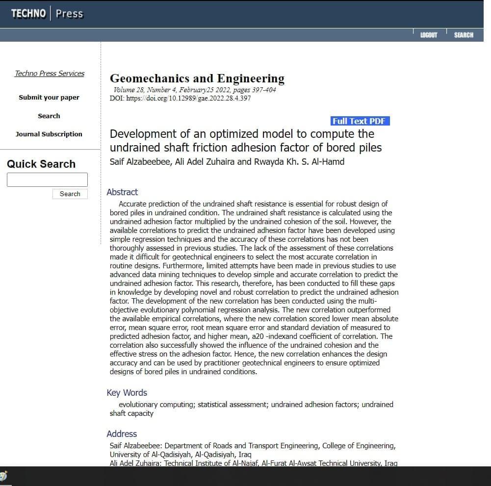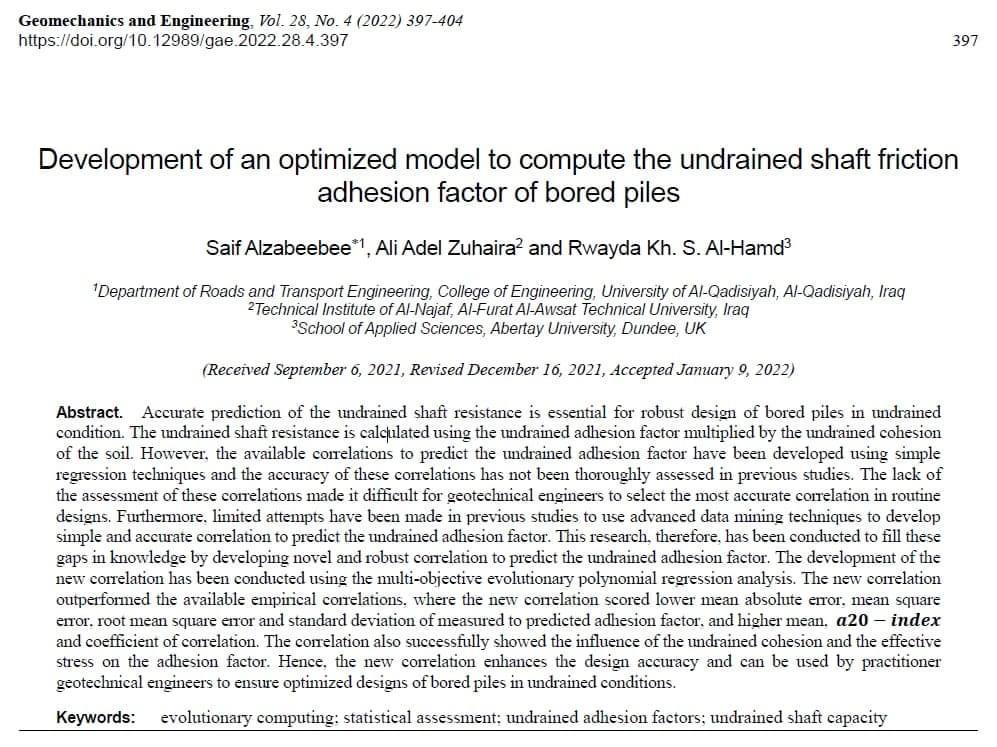 من جامعة الفرات الأوسط التقنية و جامعة ابرتي, المملكة المتحدة بحثه الموسوم تطوير نموذج محسن لحساب معامل التلاصق غير المبزول لمقاومة الأحتكاك لركائز الحفر
