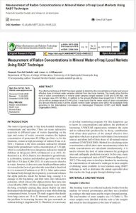 وتضمن البحث تطبيق التقنية الفعالة لـ RAD7 لتحديد تركيزات الرادون والجرعة السنوية الفعالة من عينات المياه المعدنية التي تم جمعها من الأسواق المحلية العراقية. بينت النتائج أن مستوى تركيزات الرادون في عينات المياه المعدنية تراوح بين 0.035 و 0.248 بيكريل / لتر بمتوسط قيمة 0.120 بيكريل / لتر. بالإضافة إلى الجرعة الفعالة السنوية التي تراوحت من 0.129 إلى 0.905 ميكرو سيفرت / سنة بمتوسط قيمة 0.440 ميكرو سيفرت / سنة. وجد أن القيمة المتوسطة لتركيز الرادون والجرعة الفعالة السنوية في جميع عينات المياه المعدنية المدروسة كانت ضمن الحدود المقبولة وفقًا للجنة الدولية للوقاية من الإشعاع (ICRP) ومنظمة الصحة العالمية (WHO).