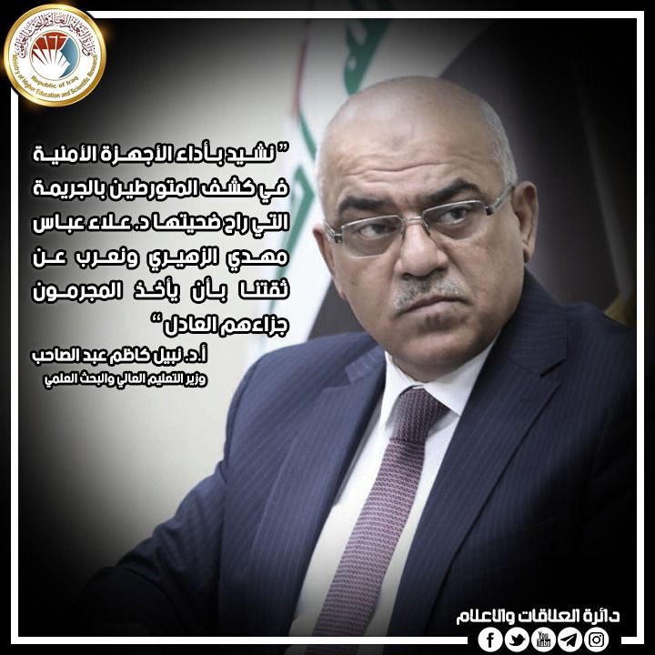 *وزير التعليم يشيد بأداء الأجهزة الأمنية في كشف المتورطين بالجريمة التي راح ضحيتها الدكتور علاء عباس مهدي الزهيري*