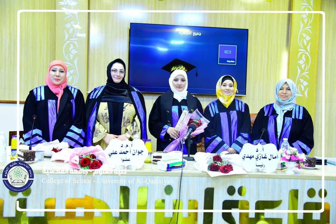 ناقشت رسالة ماجستير في قسم علوم الحياة بكلية العلوم في جامعة القادسية استخدام العصيات اللبنية الحامضية كعلاج لأصابات البكتريا المرتبطة مع مرضى قرح القدم السكري للطالبة أسيل حسين جابر.