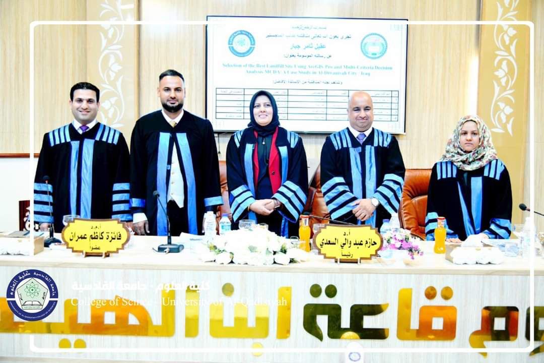 ناقشت رسالة ماجستير في قسم علوم البيئة بكلية العلوم في جامعة القادسية اختيار أفضل موقع لمكب النفايات باستخدام برنامج ArcGIS Pro وتحليل القرار متعدد المعايير MCDA في مدينة الديوانية / العراق للطالب عقيل ثامر جبار وبأشراف الاستاذ المساعد الدكتور سلوان علي عبيد الحمزاوي .