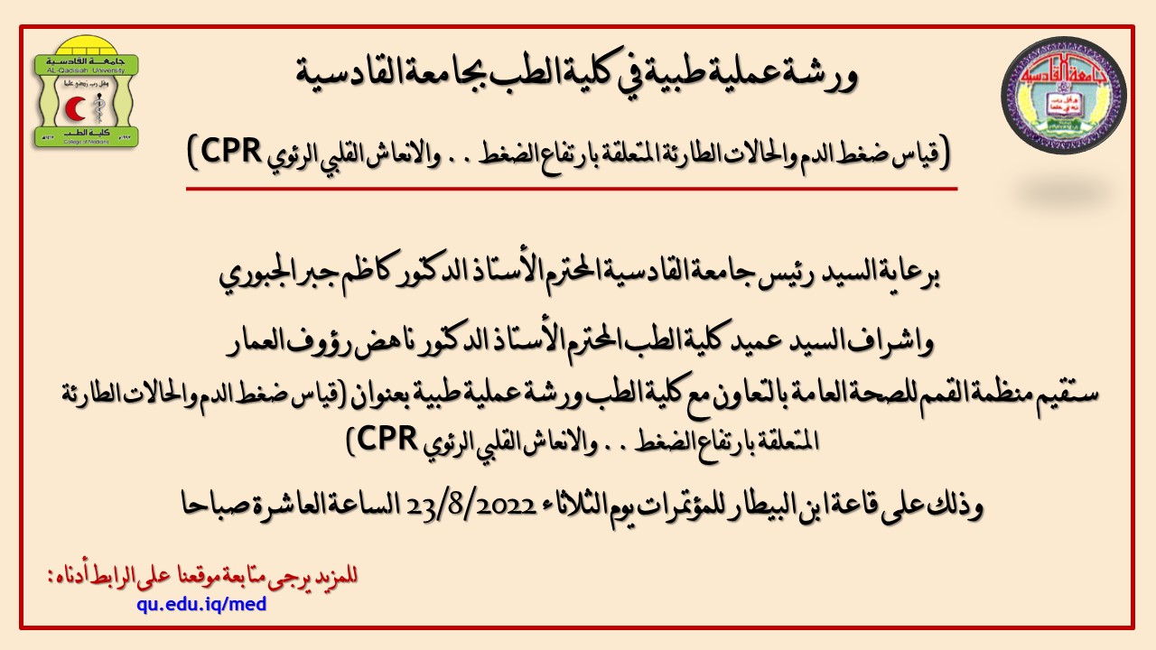 برعاية السيد رئيس جامعة القادسية الأستاذ الدكتور كاظم جبر الجبوري واشراف السيد عميد كلية الطب الأستاذ الدكتور ناهض رؤوف العمار .