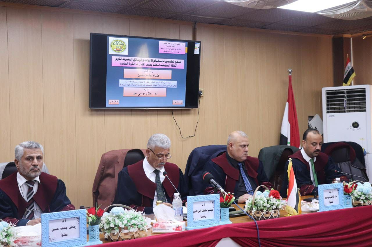 ناقشت رسالة الماجستير في كلية التربية البدنية وعلوم الرياضة بجامعة القادسية منهج تعليمي باستخدام الادوات الوسائل البصرية لذوي الاعاقه السمعية لتعلم بعض مهارات الكرة الطائرة للطالب ضياء جاسم حسين باشراف الأستاذ الدكتور حازم موسى عبد.