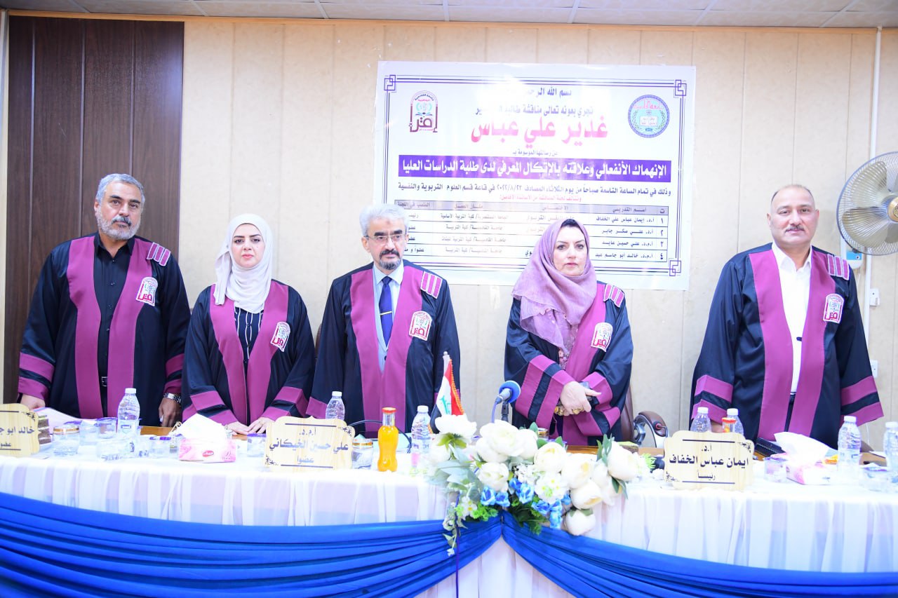 ناقشت رسالة الماجستير في كلية التربية بجامعة القادسية والموسومة (الانهماك الانفعالي وعلاقته بالاتكال المعرفي لدى طلبة الدراسات العليا ) للطالبة غدير علي عباس بإشراف الاستاذ المساعد الدكتور خالد ابو جاسم عبد